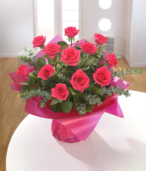 A dozen cerise Roses and Eucalyptus presented as an aqua pack hand-tied.