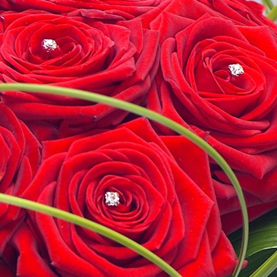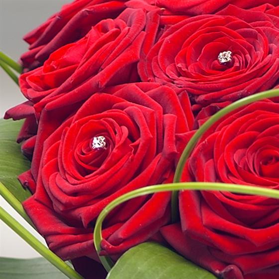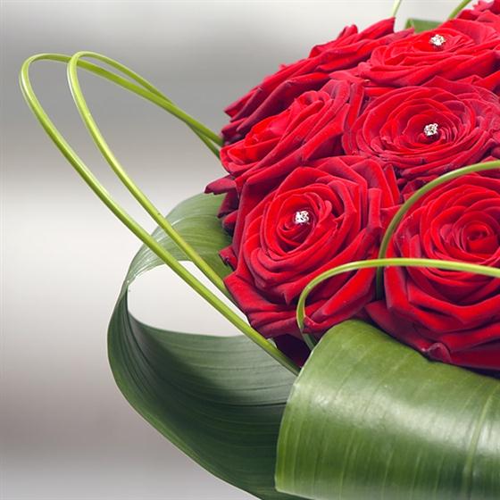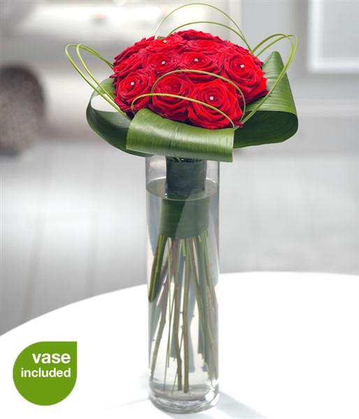 Prestigious red Roses sprinkled with diamante and beautifully presented in an elegant clear glass vase. Absolutely stunning.