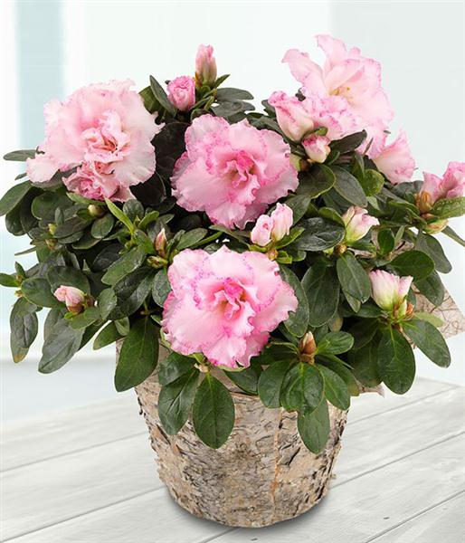 A pretty pink Azalea plant in a bark pot. A wonderful gift that keeps on growing.