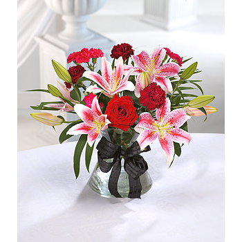 Striking pink Lilies, mixed with deep red Roses and Carnations. A generous bouquet to show your love.