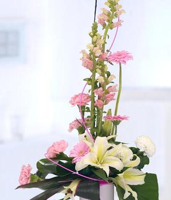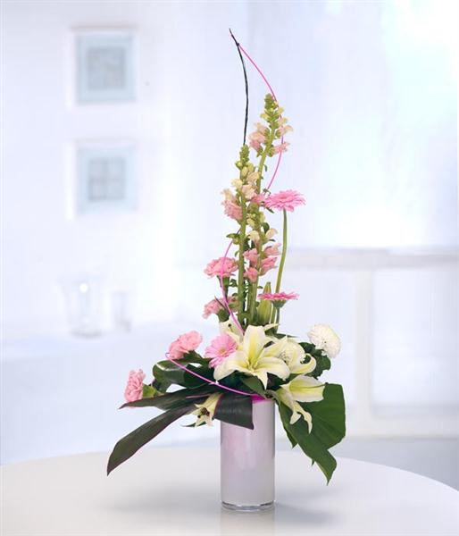 A tall pink and cream modern vase arrangement including Antirrhinum, Gerbera, Lilies, Chrysanthemums and Carnations finished with modern structural detail. Flowers are arranged in floral foam within a white cylinder glass vase for long lasting freshness and easy display.