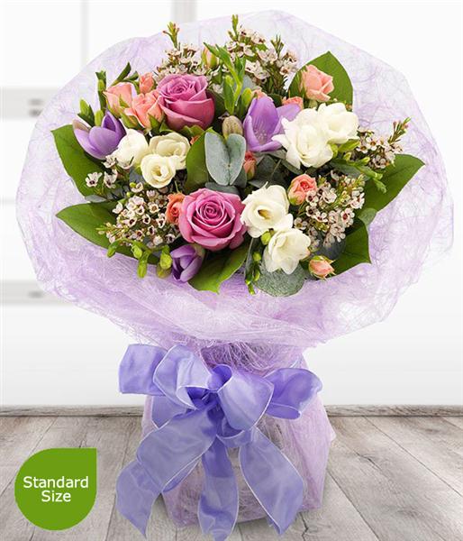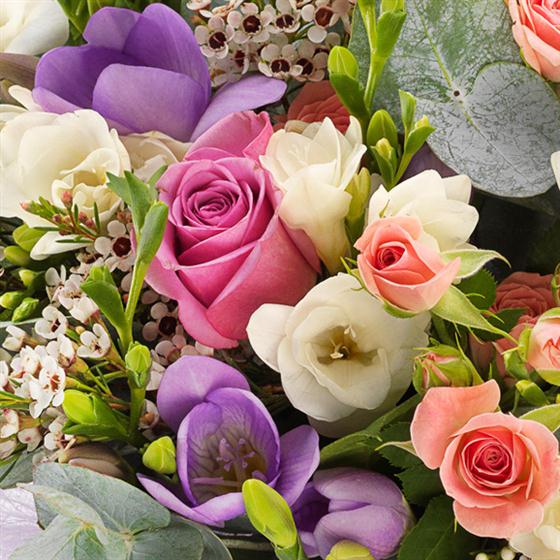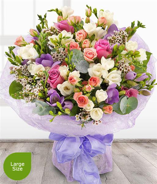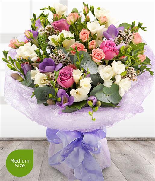 An absolutely beautiful and divinely delicate aqua pack bouquet. Lavender Roses, pink Spray Roses with white and lilac fragrant Freesias sit perfectly alongside pink Wax Flowers.