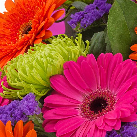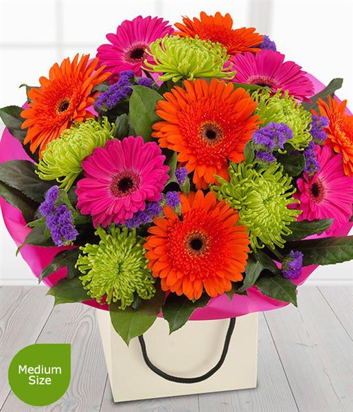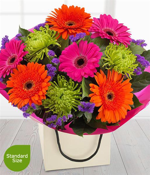A bright and dramatic flower gift bag bouquet. Cerise and orange Gerberas married with deep purple Statis and glorious green Chrysanthemums. If you're going for WOW this is the bouquet for you.