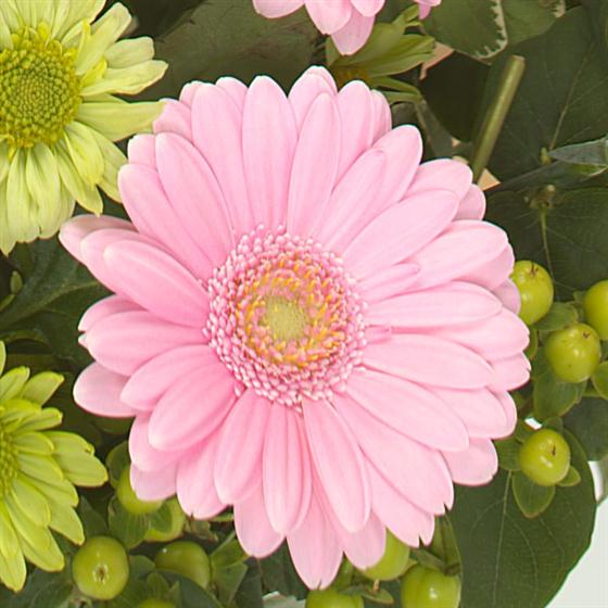 A classic bouquet of pink Roses, Germini and spray Chrysanthemums.