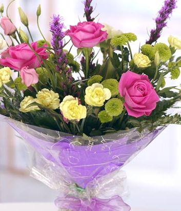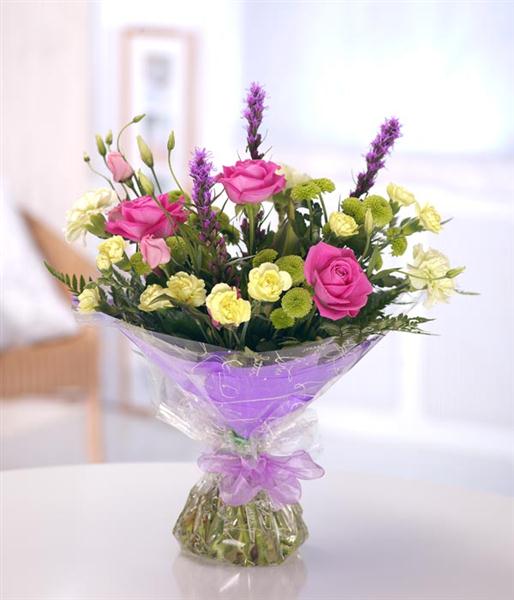 A delightful hand-tied bouquet with pink Roses, cream Carnations, Chrysanthemums, Liatris and Lisianthus and contrasting foliage. Presented in an aquapack for instant display and finished with complementary packaging.