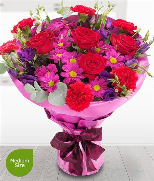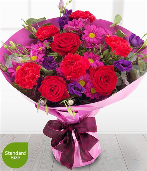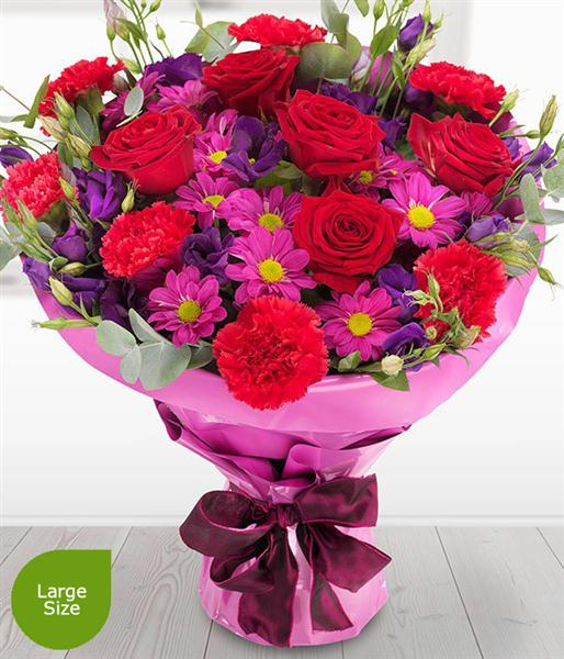 A magnificently intense romantic bouquet featuring ruby red Roses, mauve Spray Chrysanthemums, cerise Carnations and deep purple Lisianthus blooms.