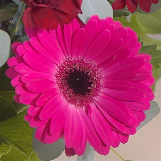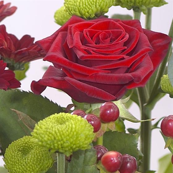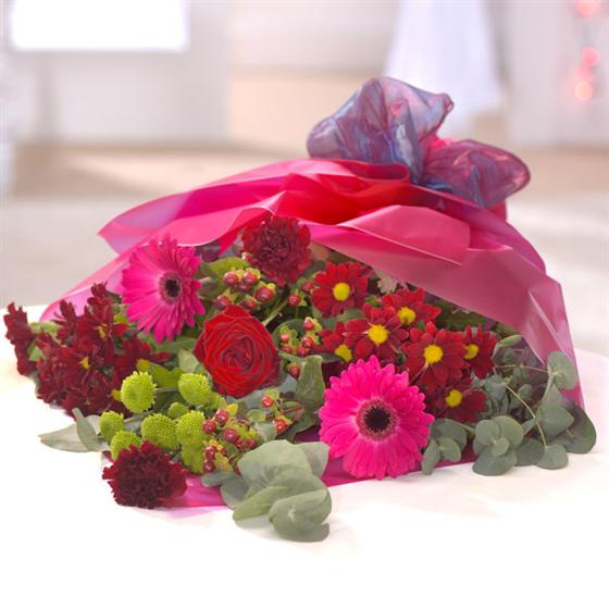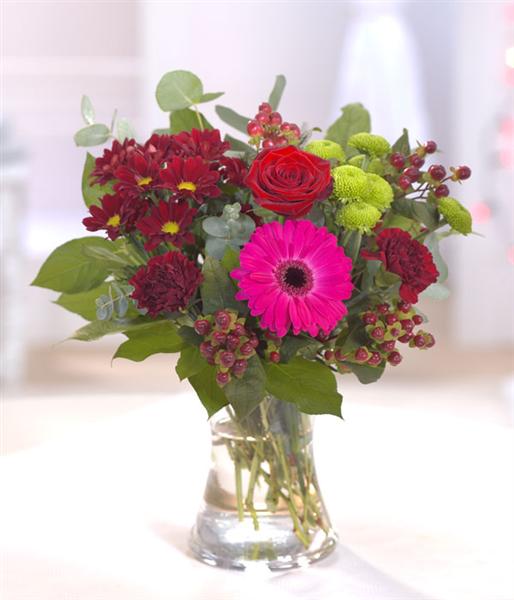 Romantic reds and burgundy are incorporated into this romantic bouquet including a red Rose, Gerberas, Carnations and Chrysanthemums. Vase not included but can be bought separately to enhance the gift.