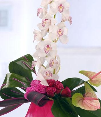 A striking pink and white modern flower arrangement featuring pink Roses, Cymbidium Orchids and Anthurium presented in a clear glass vase.