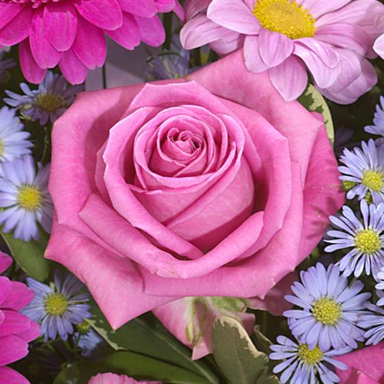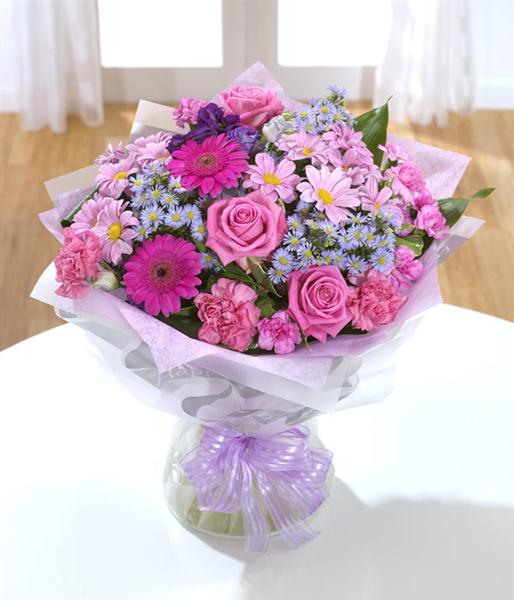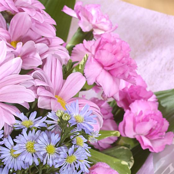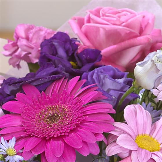 A classic pink and purple hand-tied aquapack featuring Roses, Germini, Spray Carnations, Chrysanthemums, Lisianthus and September Flower.