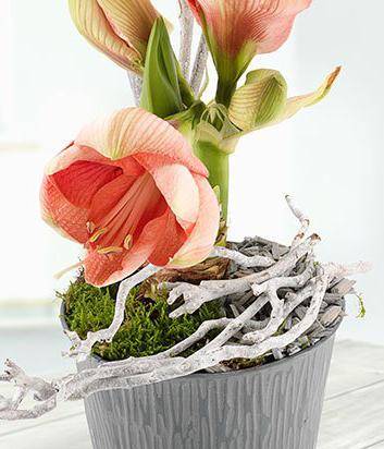 A gorgeous salmon pink Amaryllis plant exquisitely presented in a grey metallic pot.