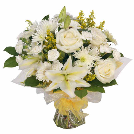 Do your bit by making someone happy with this hand-tied bouquet of cream and white Roses, Mini Gerbera, Lilies, Carnations and Chrysanthemums presented in an aquapack for instant display.
