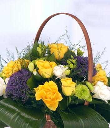 A charming traditional basket arrangement featuring yellow Roses, Freesias, Trachelium and Chrysanthemums finished with rich green foliage. Flowers are arranged in floral foam for long lasting freshness and easy display.