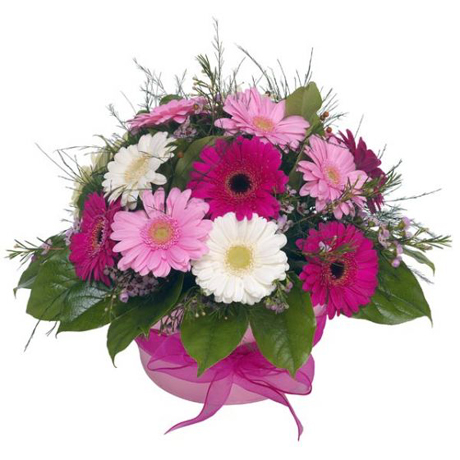 A charming arrangement of pink and white Mini Gerbera in a modern container. Flowers are arranged in floral foam for long lasting freshness and easy display