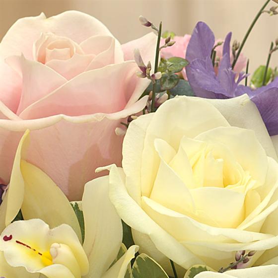 A fragrant delight of country style flowers, including white Roses, Orchids, Freesias and pink Carnations delivered in a basket.