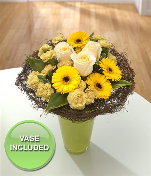 Roses, Germini and golden spray Chrysanthemums sit in this attractive, natural twig collar in a vase.
