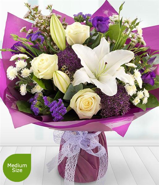 Includes White Rose, White Lily, Purple Lisianthus, White Wax Flower, Purple Statis, Trachelium, White Chrysanthemum, Eucalyptus, Salal.