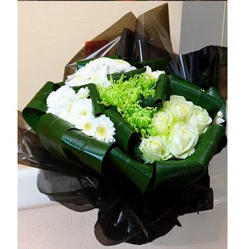 What a fabulous Gift! - Your florist has created this fabulous Handtie Bouquet with a stunning mix of the most beautiful, vibrant Gerbera, Green Shamrock and White Avalanche Roses.
