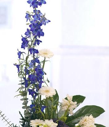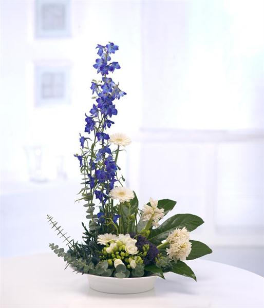 A delightful arrangement featuring mixed blue and white flowers including Gerberas, Delphiniums, Eryngium, Freesias, Hyacinths and rich green foliage. Flowers are arranged in floral foam in a white plastic container for long lasting freshness and easy display.