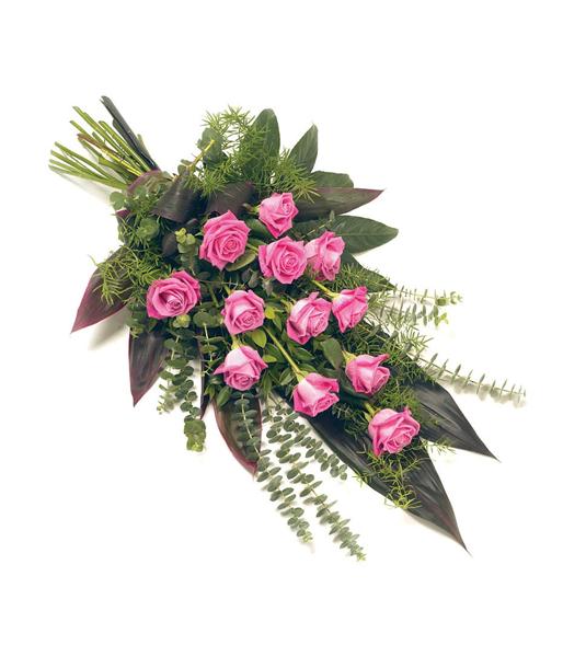 A classic and elegant sheaf of roses and complementary foliage tied with a ribbon. Size: 64cm (25").