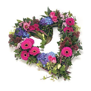 Textured open heart shape tribute in shades of pink and blue, including Roses, Gerbera, Hydrangea, Eustoma and complementary foliage edge. Size: Height - 43cm (17") Width - 43cm (17").