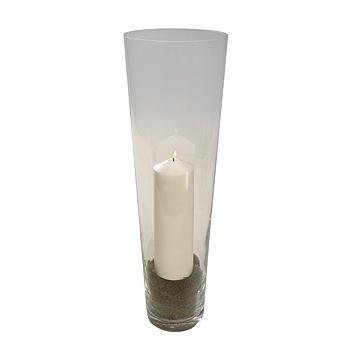 A stylish high glass cone vase with a large church candle sitting on a bed of Bun Moss.
