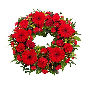 A bright red wreath featuring Roses, Gerbera and Carnations with a mix of lusciuous green foliage.