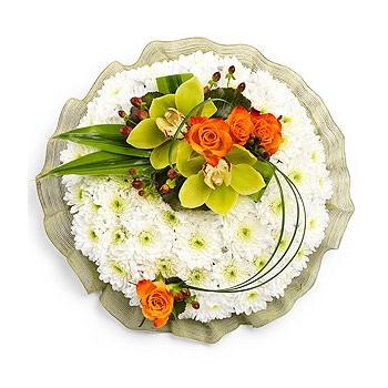 A white Chyrsanthemum based posy pad with a spray of orange Roses, green Cymbidium Orchids and bronze Hypericum neatly finished with a hessian trim.