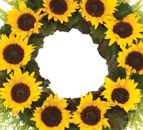 A beautifully bright Sunflower wreath with yellow Solidago and Galax Leaf trim.