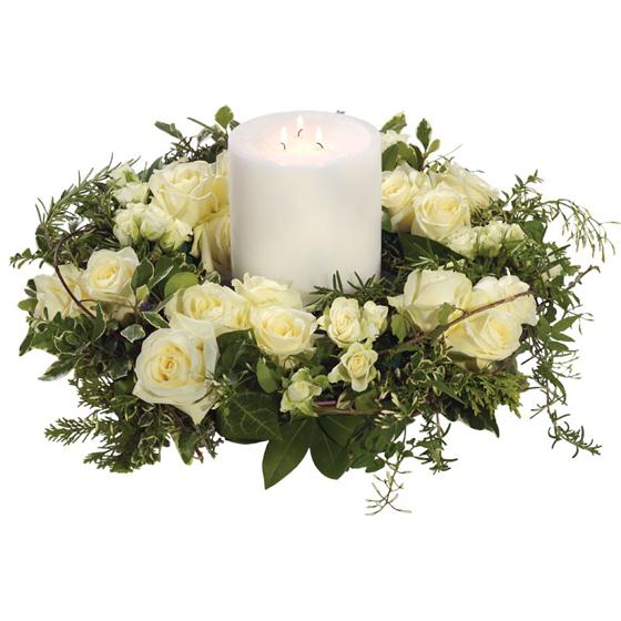 A three wick church candle encompassed by a white Rose and Jasmine wreath with foliage.