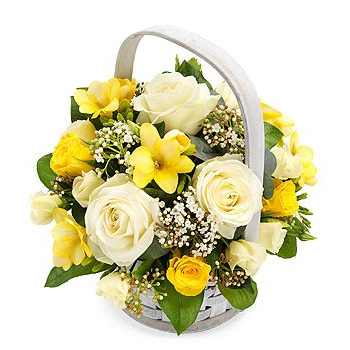 A pretty white wash basket arrangement containing white and yellow Roses together with yellow Lisianthus and white Viburnum.